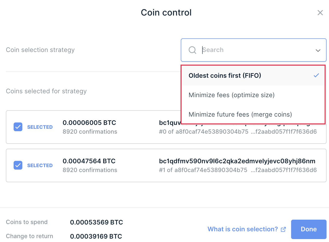 En 2020, Ledger a sorti une fonctionnalité intégrée à leur application Ledger Live appelée « Contrôle des coins ». Elle permet de modifier le comportement par défaut de l’utilisation des UTXO lors de création d’une nouvelle transaction.